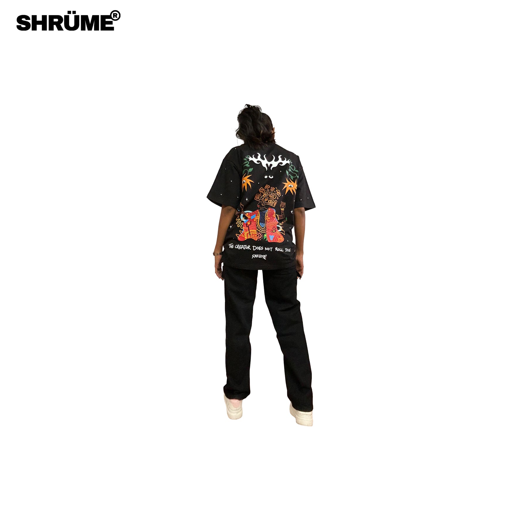 Black round neck t-shirt with original SHRUME artwork printed on back and front.