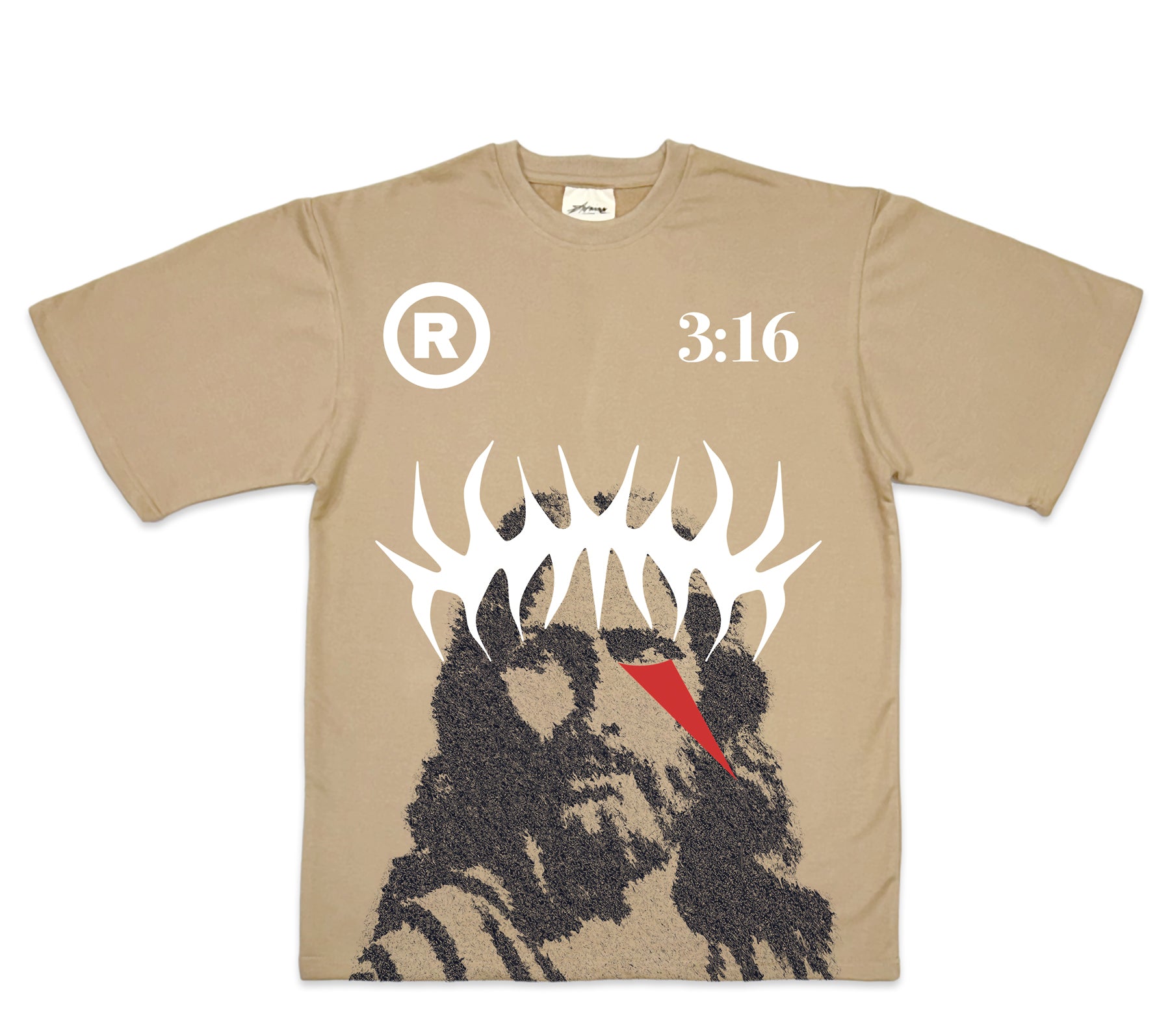 Beige round neck t-shirt with original SHRUME artwork printed on back and front.